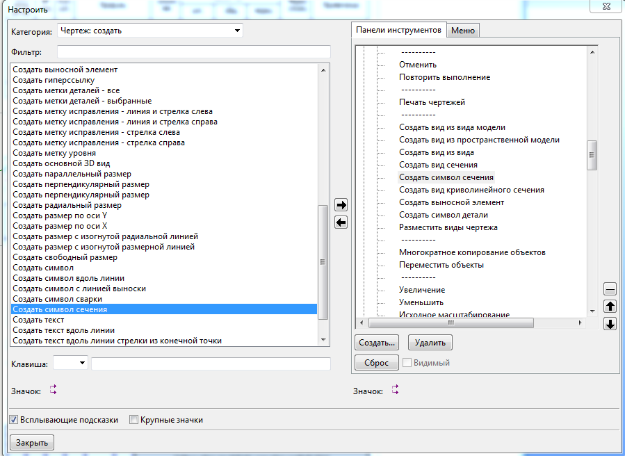 Инструменты-Настройка-Категория:чертёж: создать-Создать символ сечения