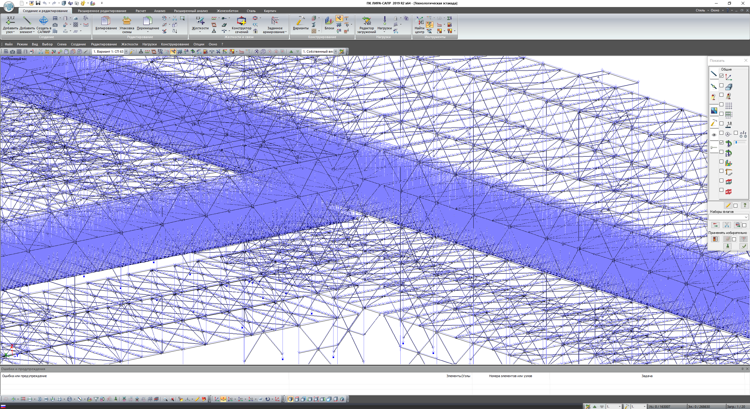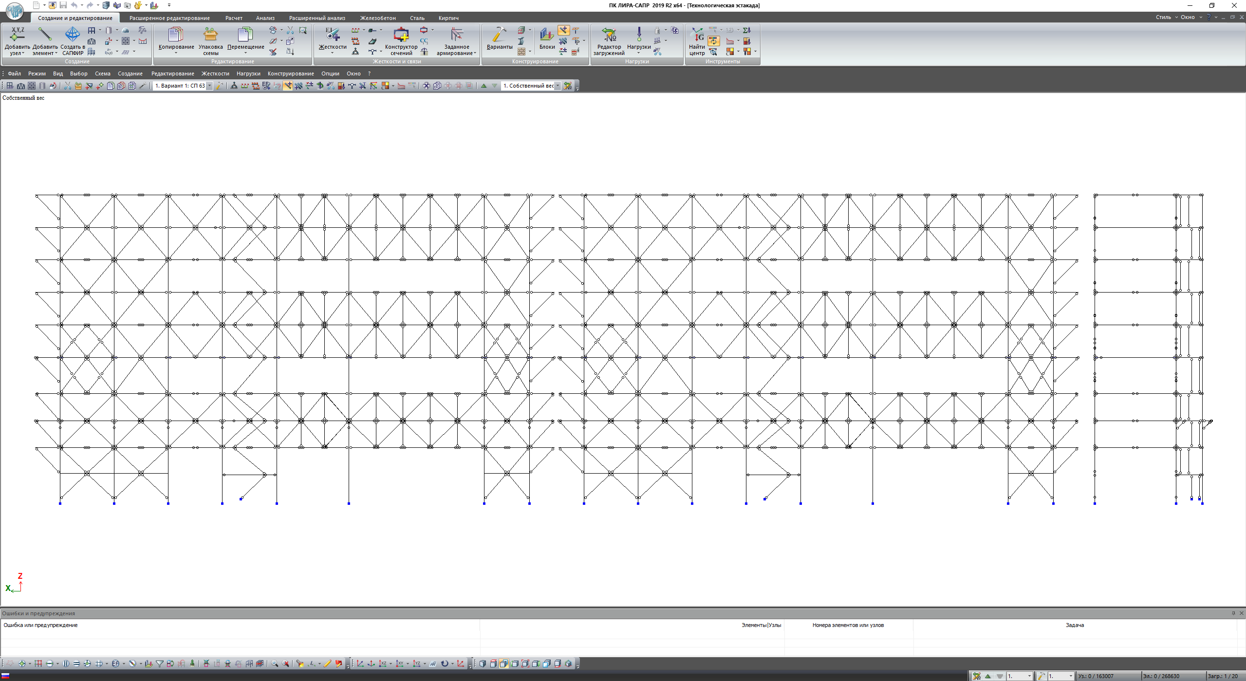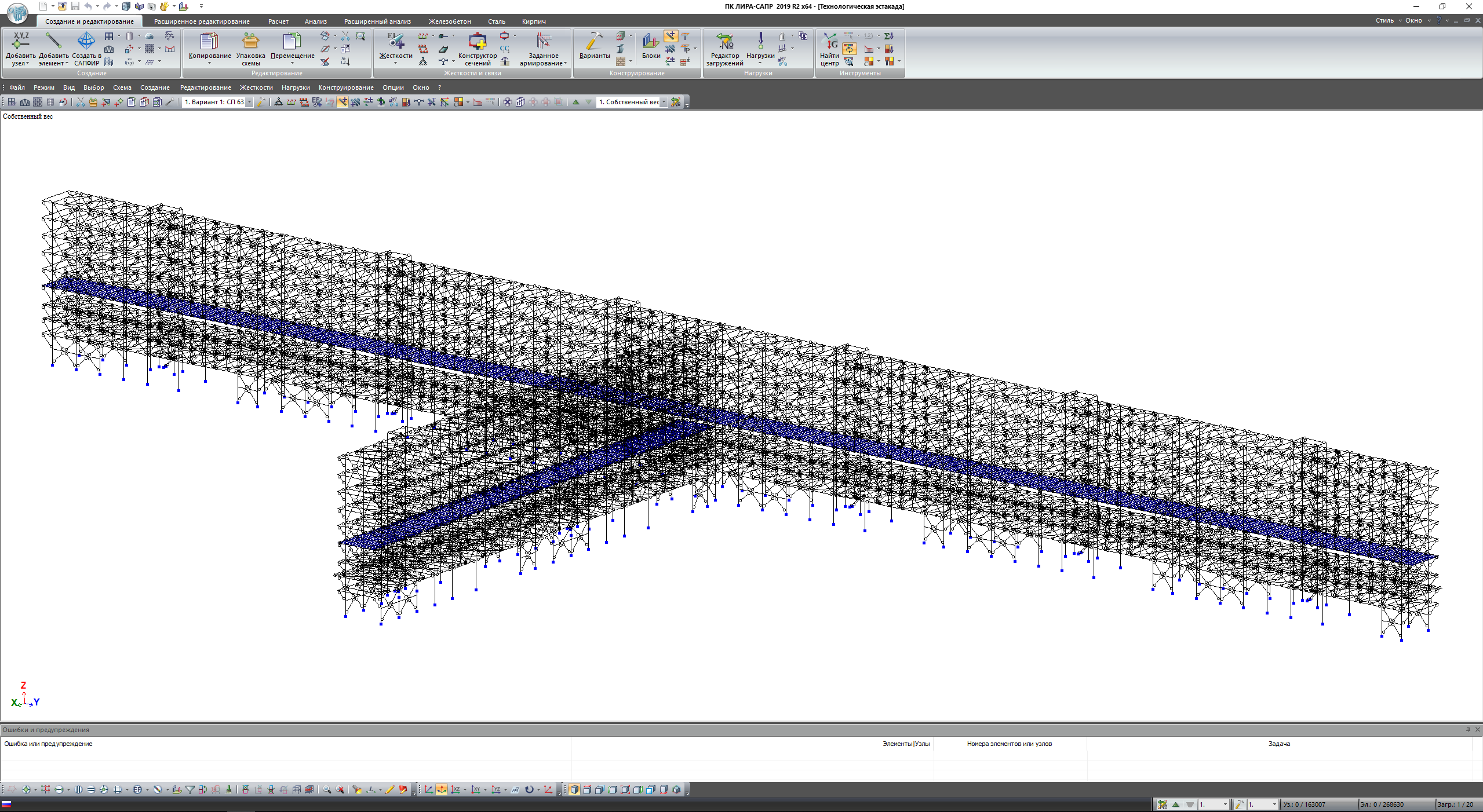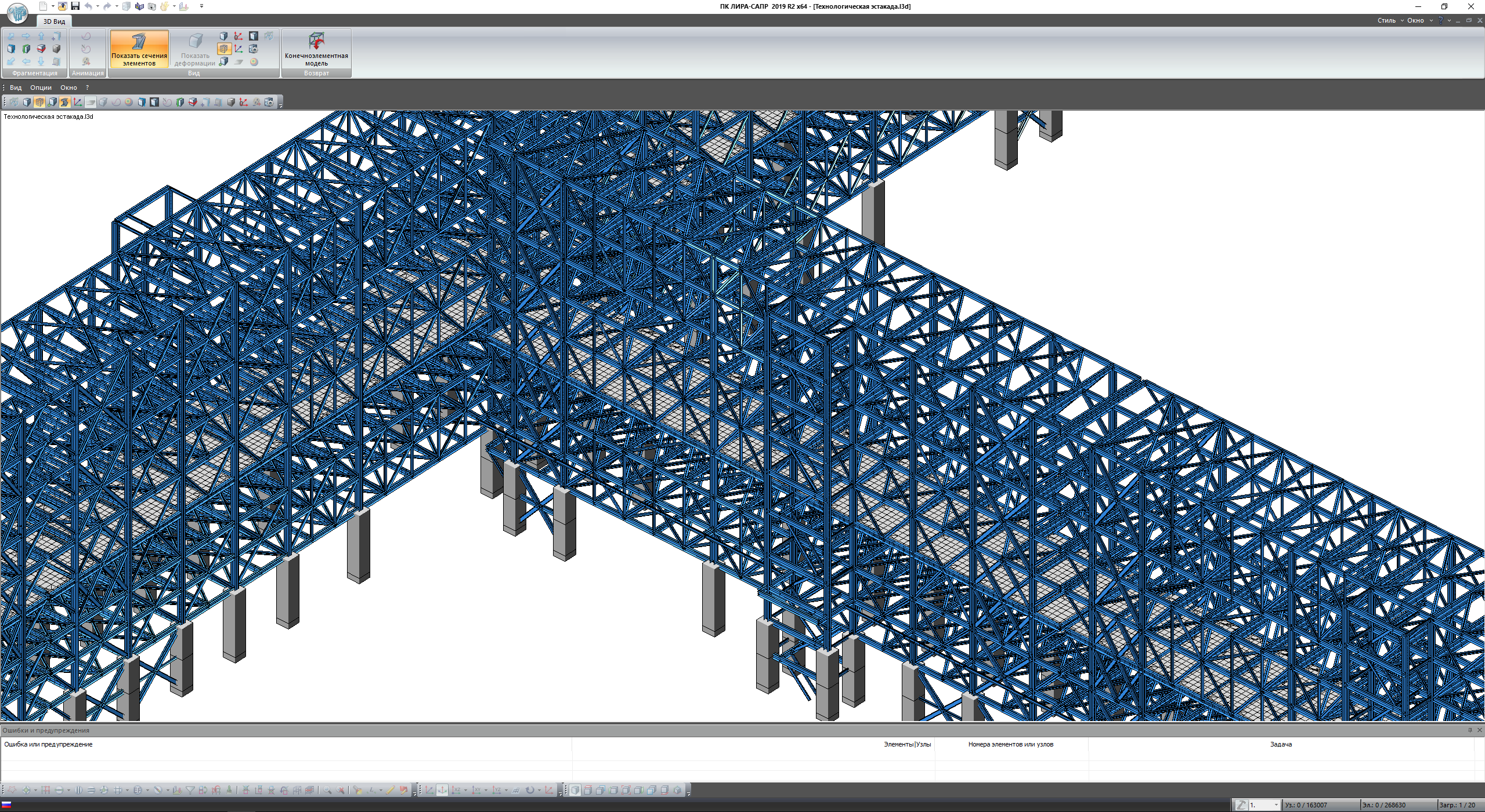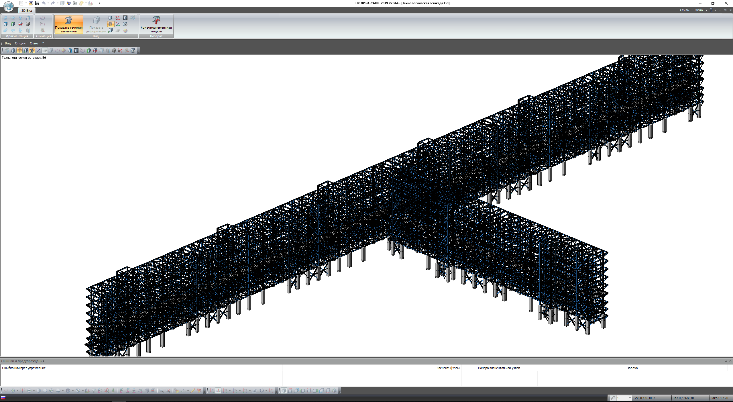 При работе над объектом были смоделированы многопролетные эстакады высотой 35м. Необходимость моделирования большого количества пролетов заключалась в разнообразных статических и динамических нагрузках от действия оборудования, расположенных на протяжении длины эстакады. Для расчета совместной модели моделировались ветровые, снеговые и прочие нагрузки. Так же проводились расчет и проверка элементов эстакад на действие пульсационного ветрового воздействия, проектного и максимального расчетного землетрясения. При расчете осадки грунтового основания учитывалось взаимовлияние фундаментов блоков эстакады.