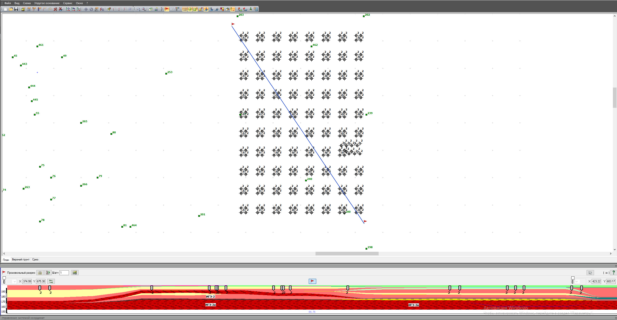 Объект представляет собой металлический каркас пролетами 6*7 метров. Перекрытие представляет собой монолитную плиту. Общая высота сооружения 25 метров. При расчете учтены статические и динамические нагрузки, учитывалось температурное воздействие на конструкции сооружения. После расчета элементов конструкций были смоделированы грунтовое основание совместно со свайным фундаментом. Перемещения элементов и узлов конструкций меньше предельно-допустимых, осадки в рамках СП. Конструкции удовлетворяют требования 1 и 2 групп предельных состояний. Сооружение, по результатам расчета, устойчиво к прогрессирующему обрушению.