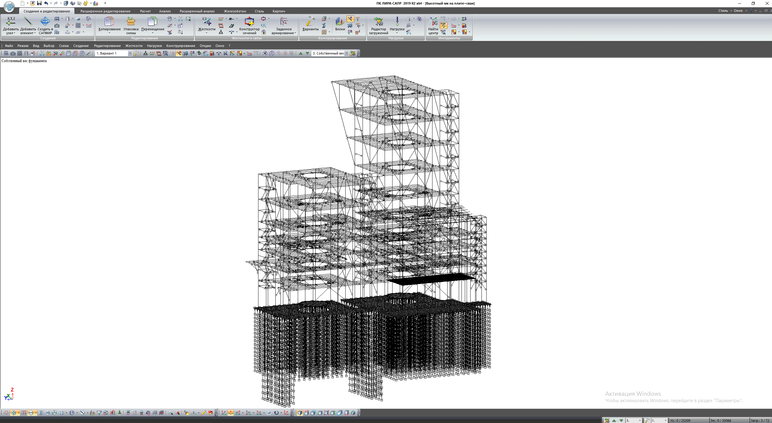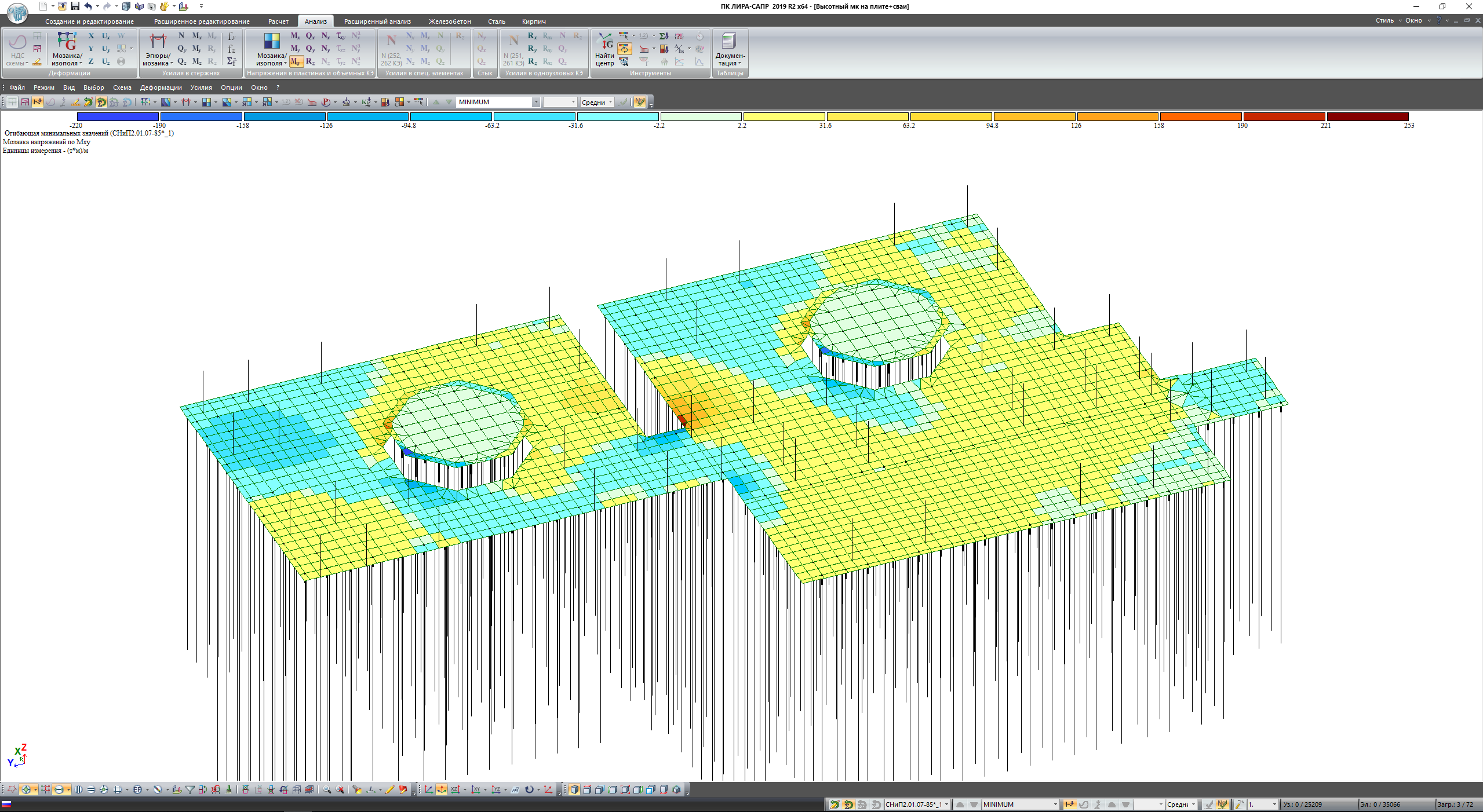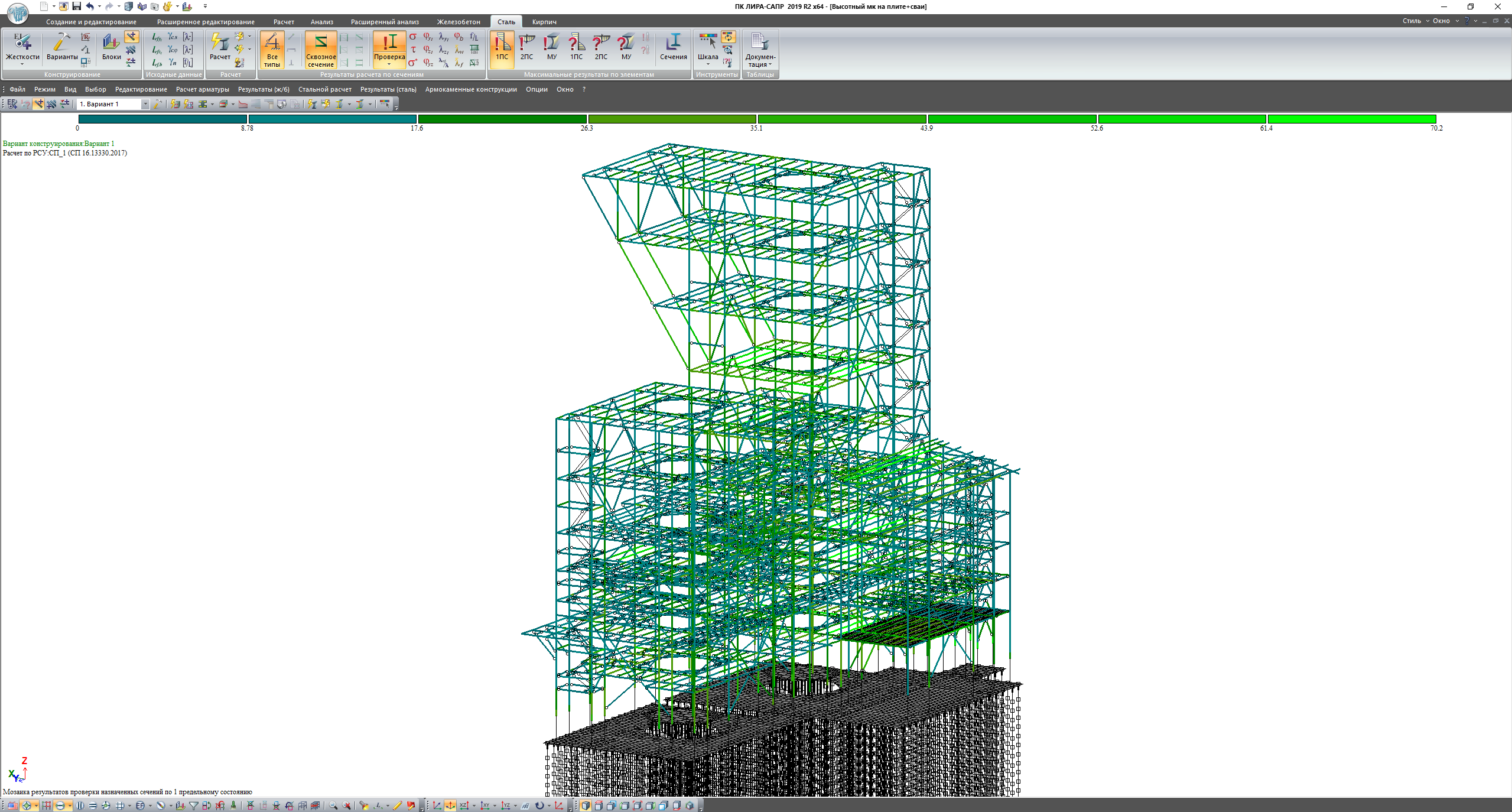 Сооружение представляет собой металлический каркас высотой 47м, жестко закрепленный на монолитной плите ростверка. Ростверк опирается на 400 свай различной высоты, сваи сгруппированы с учетом распределения усилий в ростверке. Вся конструкция рассчитывалась на действие статических и динамических нагрузок. Пульсационная составляющая ветрового воздействия и сейсмические воздействия задавались программным методом. Несущая способность свай контролировалась программным и ручным методом. По результатам расчета определяются армирование свай, плиты ростверка, подколонников, выполняется проверка конструкций на критерии 1 и 2 групп предельных состояний.