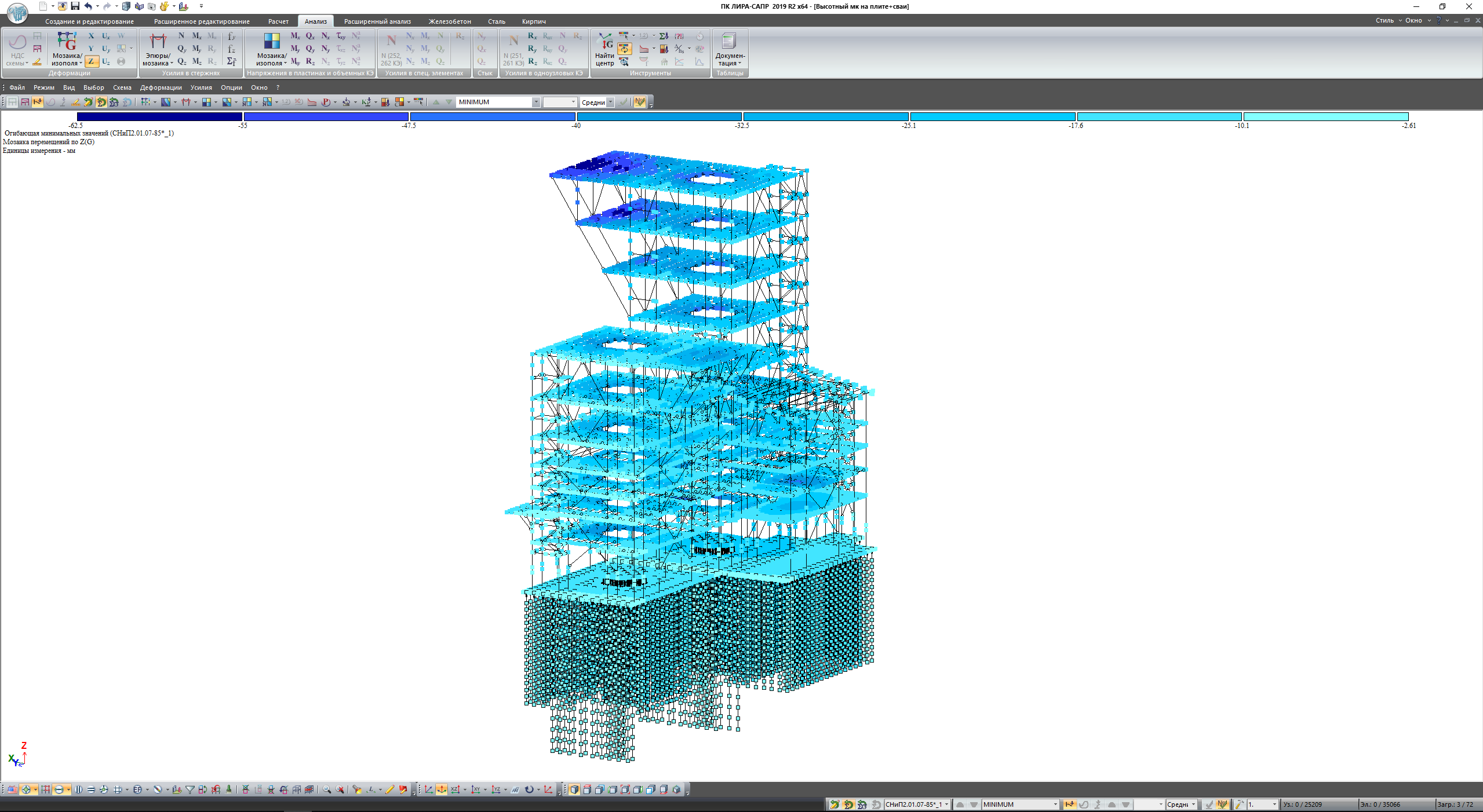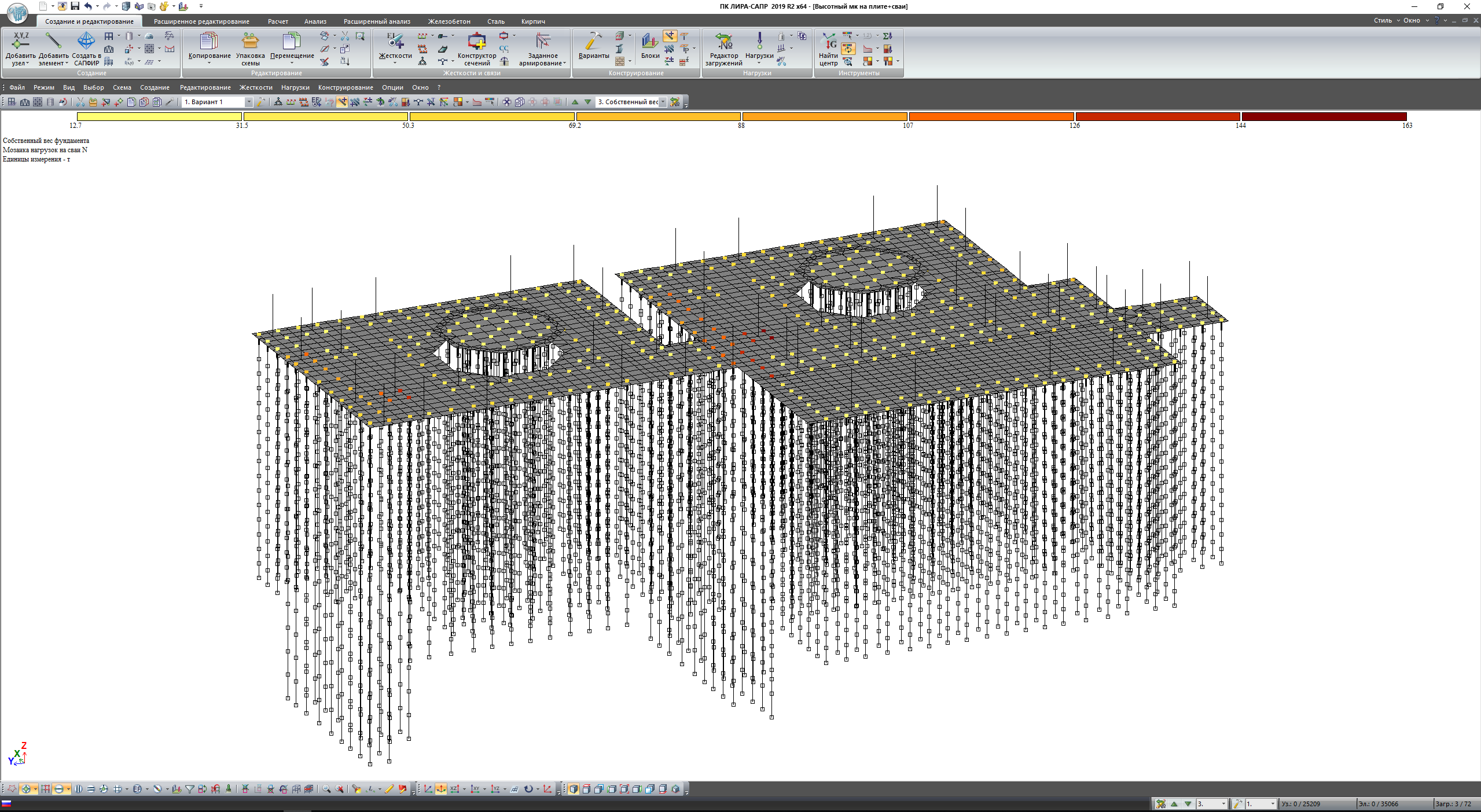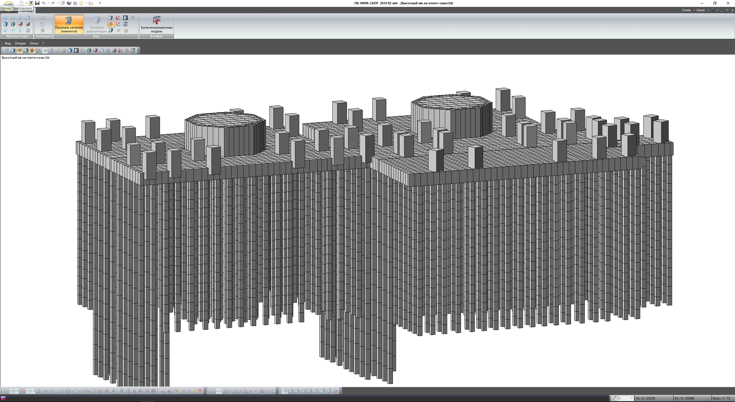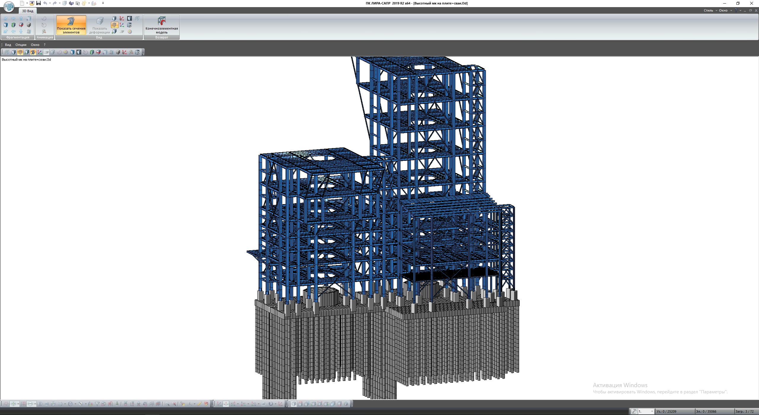 Сооружение представляет собой металлический каркас высотой 47м, жестко закрепленный на монолитной плите ростверка. Ростверк опирается на 400 свай различной высоты, сваи сгруппированы с учетом распределения усилий в ростверке. Вся конструкция рассчитывалась на действие статических и динамических нагрузок. Пульсационная составляющая ветрового воздействия и сейсмические воздействия задавались программным методом. Несущая способность свай контролировалась программным и ручным методом. По результатам расчета определяются армирование свай, плиты ростверка, подколонников, выполняется проверка конструкций на критерии 1 и 2 групп предельных состояний.