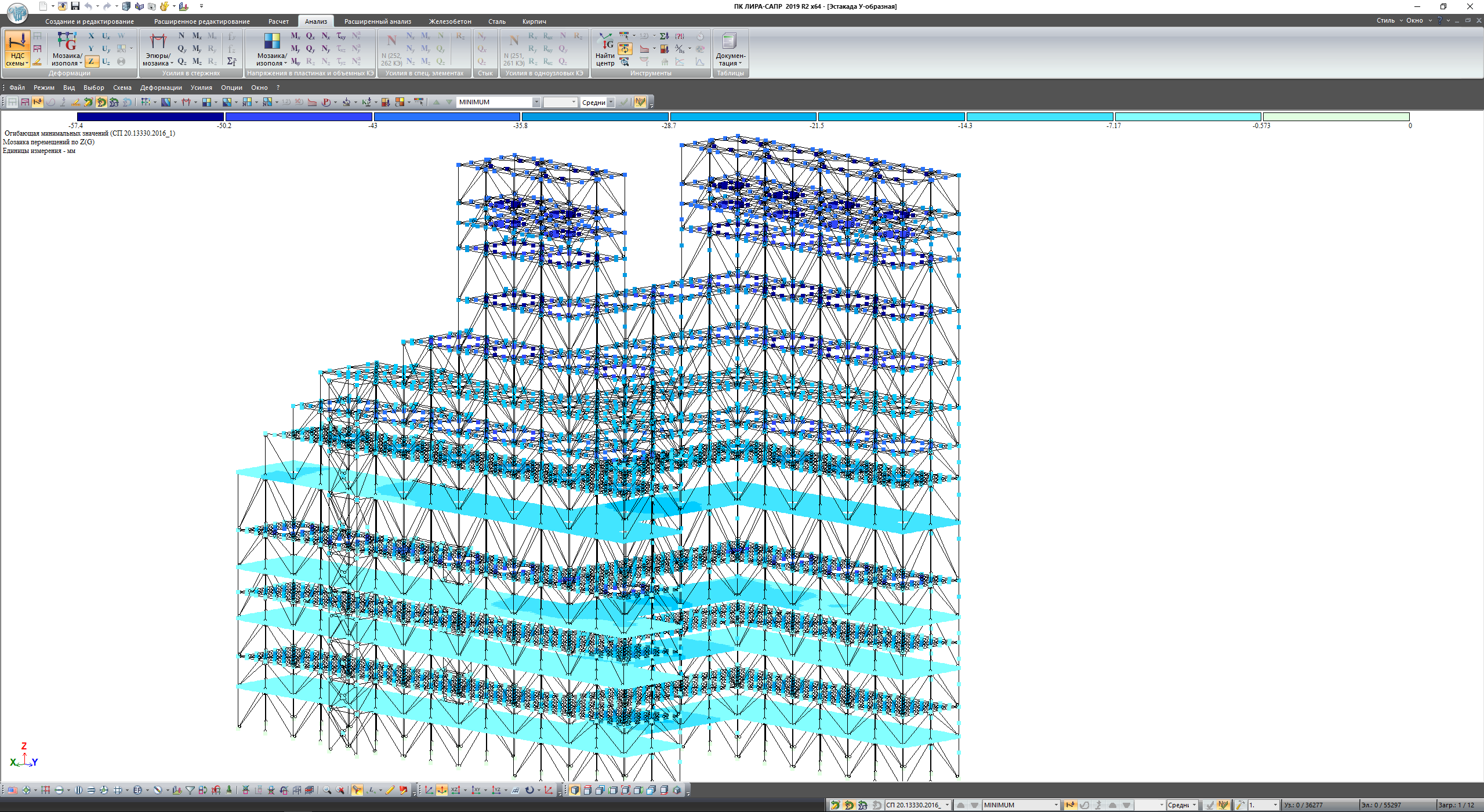 Сооружение представляет собой многоуровневую технологическую эстакаду. Каркас эстакады выполнен из жестких металлических поперечных рам, соединенных между собой в продольном направлении балками и вертикальными связями. На 1,3 и 5 этажах поверх металлических балок залиты монолитные плиты перекрытия. 6-й и последующие этажи имеют в плане разные габариты. Расчет выполнялся на действие статических и динамических нагрузок. Учет динамических нагрузок от оборудования проводился ручным способом, учет дин. воздействий от пульсационной составляющей ветра. По результатам расчета все стальные конструкции удовлетворяют требованиям 1 и 2 групп предельных состояний. Для железобетонных конструкций были вычислены изополя напряжений в пластинах, на основании которых в дальнейшем подбирается армирование перекрытий.