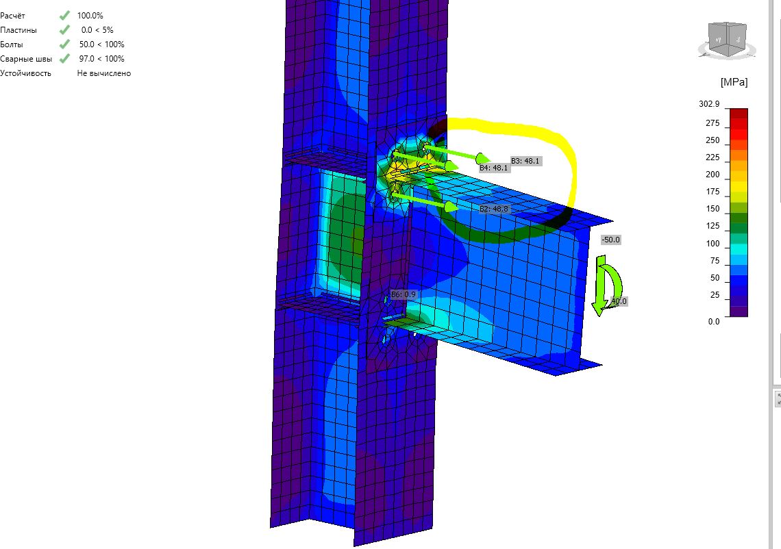 А вот тот же узел, но толщина фланца уже 10 мм. И обратите внимание на усилия в верхних болтах. Значения уже 48-49 кН.