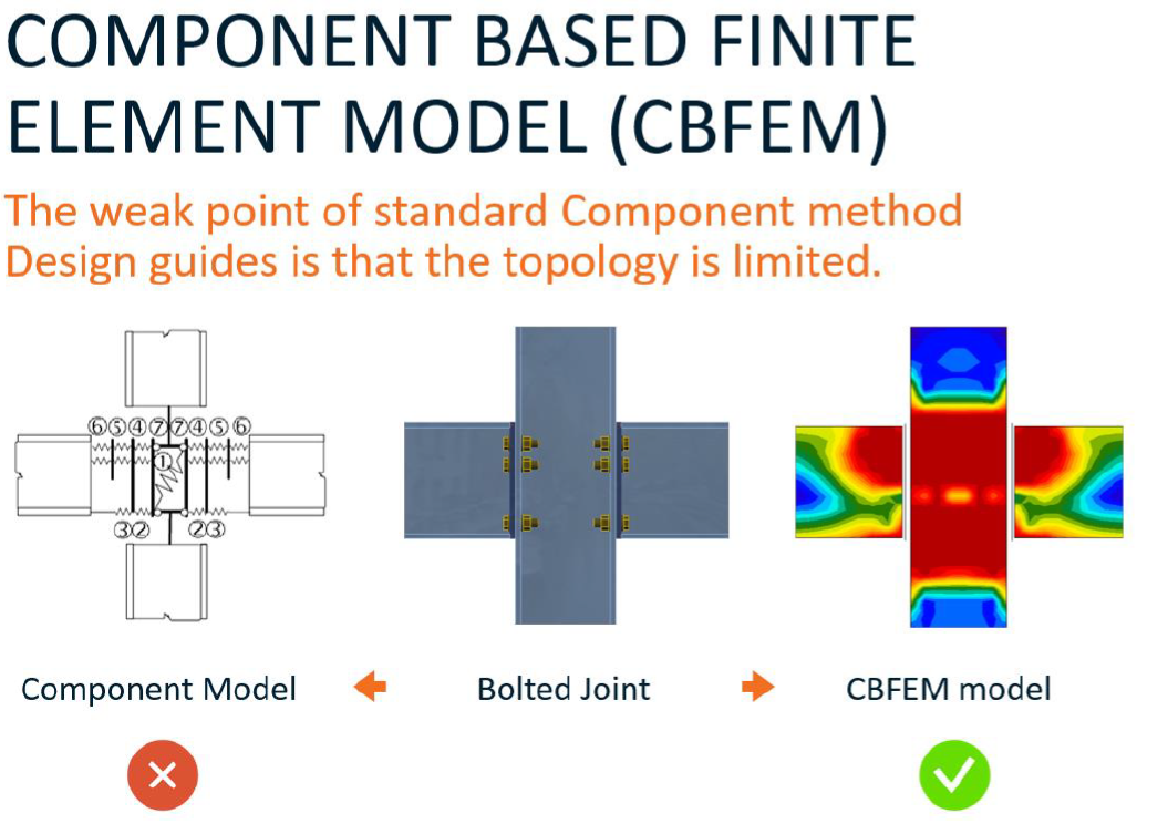 В IDEA StatiCa используется современный метод, который получил название «Компонентный метод ко-нечных элементов» или КМКЭ (Component Based Finite Element Method – CBFEM в оригинале). Он соче-тает в себе сильные стороны компонентного метода и универсальность метода конечных элементов. Для построения модели узла используются конечные элементы, в которых определяются усилия и напряжения, по которым затем выполняются необходимые нормативные проверки, как в компонент-ном методе.