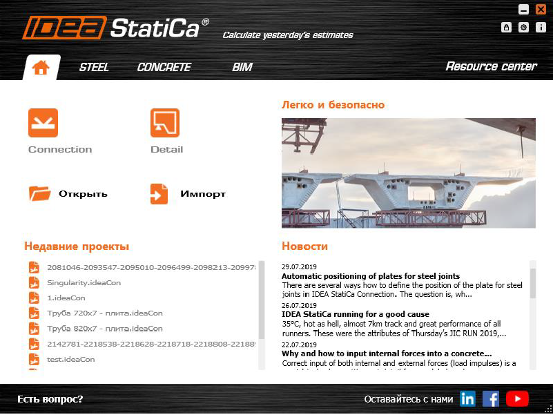 Перед Вами стартовая страница. Эдакое распутье. На кнопку «Connection» нажмёте – в программу для стальных узлов попадёте. А на «Detail» можете не нажимать, это модуль для железобетона. Мы здесь не за этим. Поэтому жмите на «Connection».