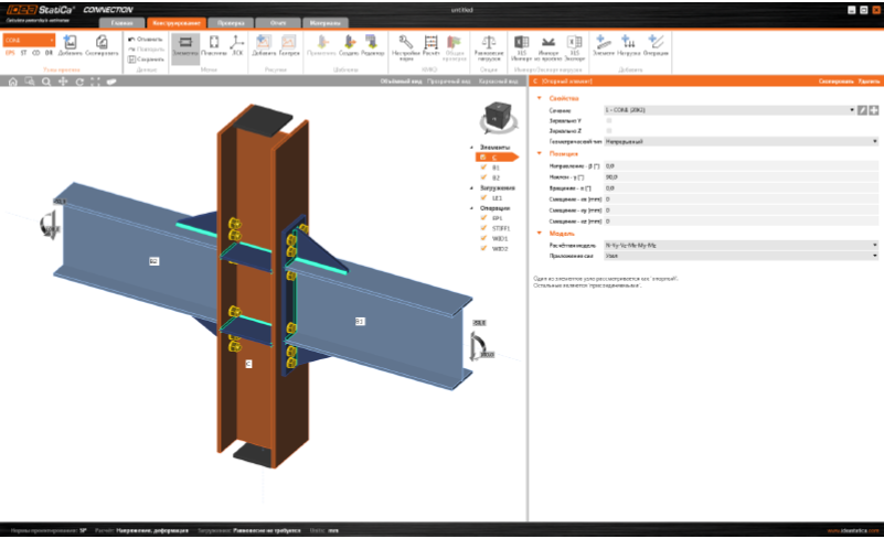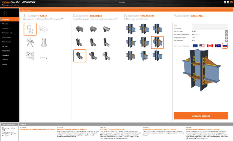 Что тут у нас? Нам сразу предлагают создать модель соединения, нажав на большую оранжевую кнопку «Создать проект». Для получения узла, показанного на рисунке выше, не нужно вручную создавать элементы, моделировать болты, высчитывать расстояния между ними и копировать их, задавать свар-ные швы и ломать голову над тем, какую диаграмму работы принять для болтов и сварки. Мы просто выбираем нормы проектирования (жмём на родной триколор), марку стали, класс болтов и материалы сварки и затем кликаем на большую оранжевую кнопку.