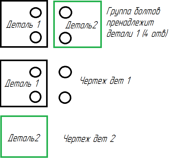 Перепробовал различные варианты выбора основной, второстепенной и остальные детали. итог: болты в модели отображаются одинаково, но на чертеже накладок вместо 4 отв. отображаются 8 отв. (4 вне контура детали). Для корректного отображения отверстий можно выйти из положения, только создавая не 2 группы по 4 болта, а 4 группы по 2 болта?