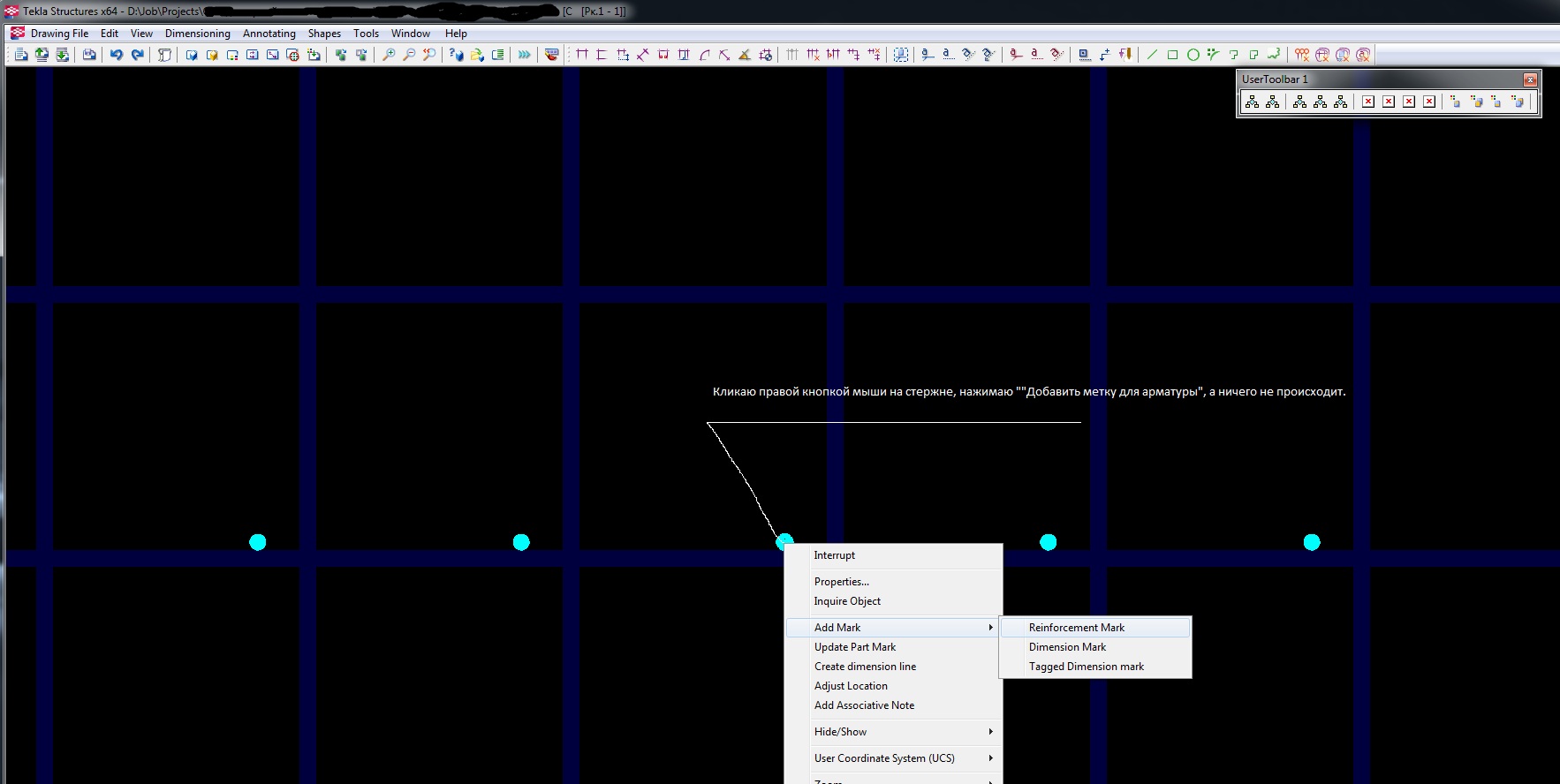 Бывает такое, что вместо меток арматурных деталей появляются какие-то точки (похожие на "ручки" меток деталей). Если эти точки появились в результате [выделения нескольких стержней -> добавить метку], то [кликнув правой кнопкой на одной из них -> объединить] метки (в виде этих точек) объединяются и появляются на экране уже нормальными выносками, точнее одной, объединённой выноской. (Как назло сейчас нигде не могу найти и зафиксировать эту ситуацию скриншотом).