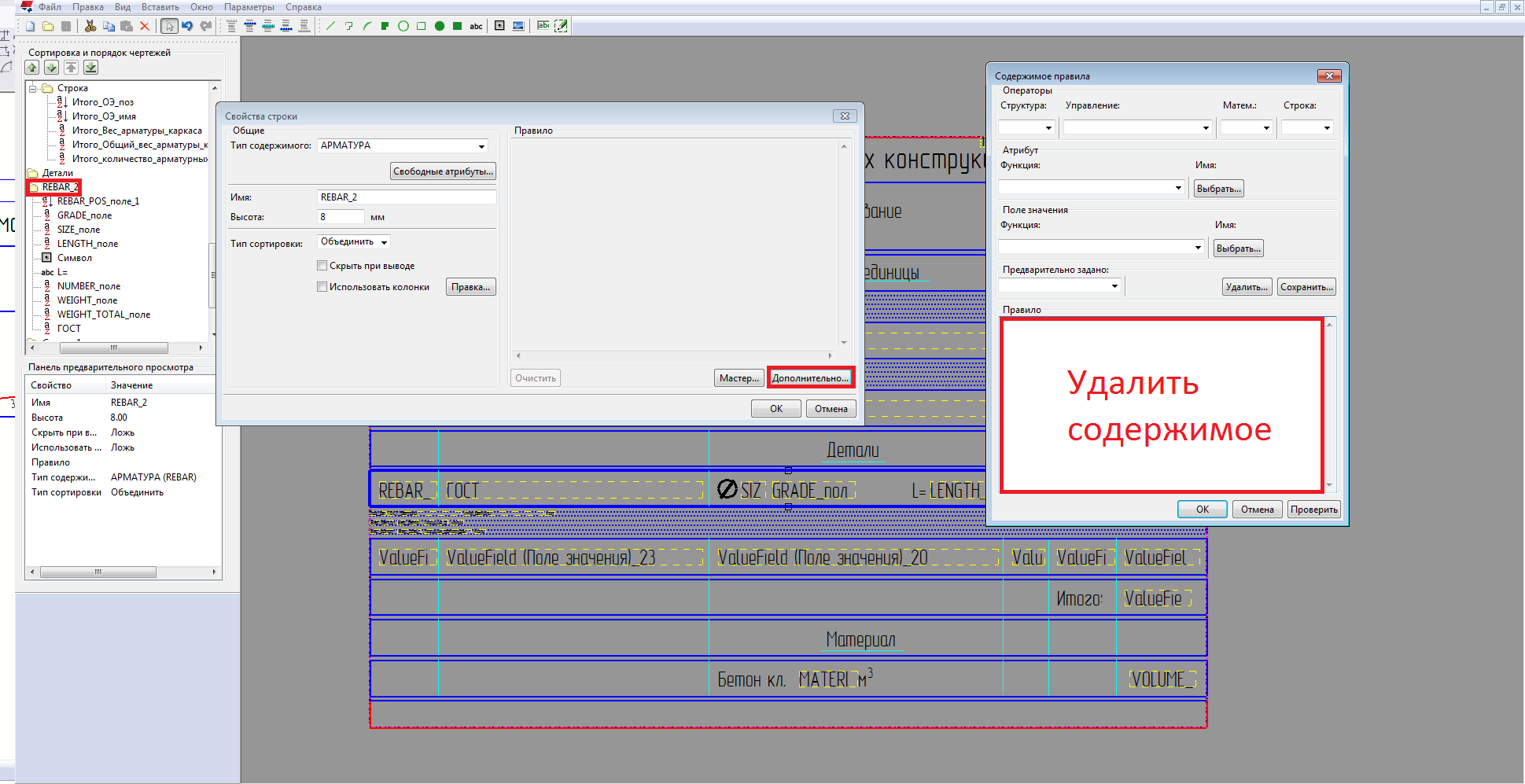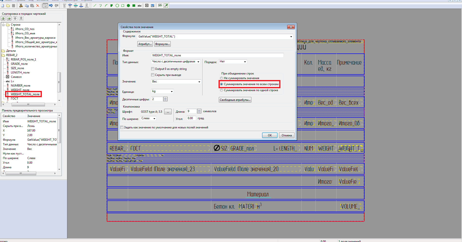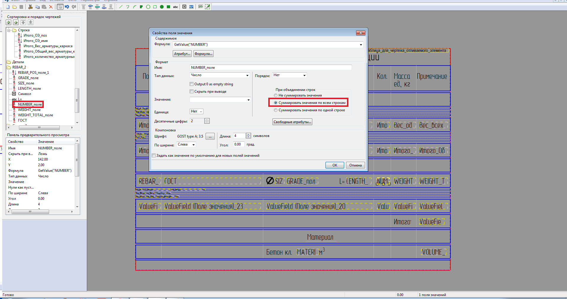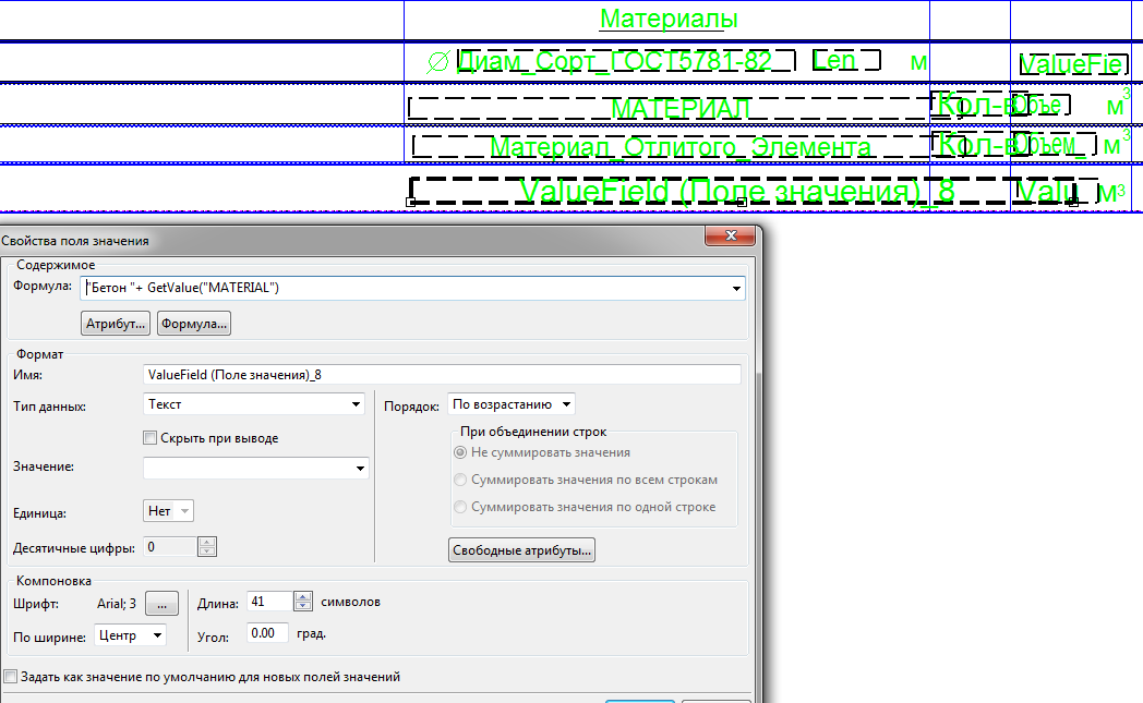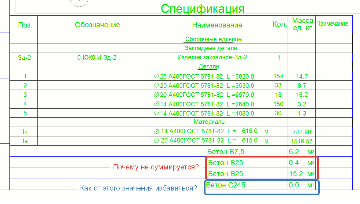 От значения стали в спецификации избавился путем добавления условия на вывод строки. Осталось понять как объединить две детали с бетоном В25 в одно значение