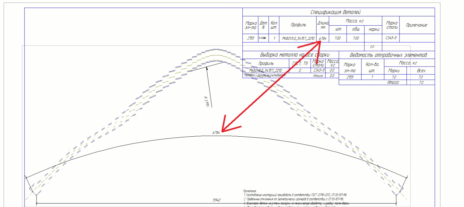 На чертеже стоит корректный размер, и по дуге и по прямой. Причем усечение размеры не меняет, размеры остаются корректными. А в спецификацию пишет длину ровной балки, которую я в модели нарисовал, до изгиба.