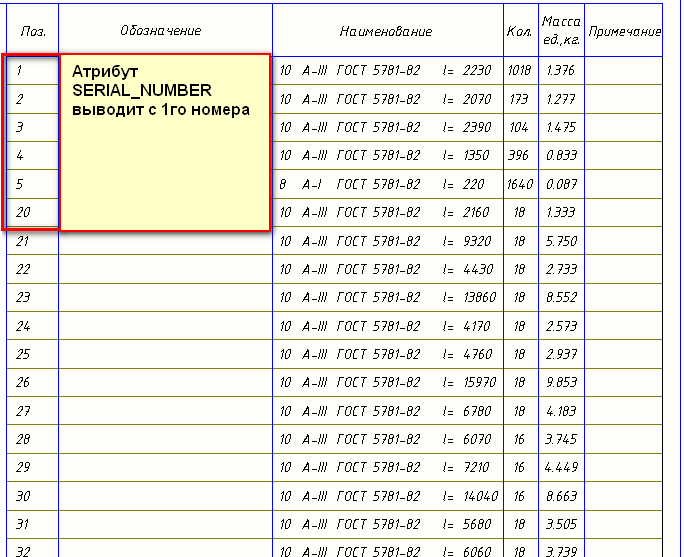 Здравствуйте! Получить общую длину по префиксу у меня кое-как получилось. Зато появилась другая проблема. Поставив начальный номер для нумерации отдельных стержней - 2, позиция стержня, как и положено, выводится с 2го номера, но когда выбрать в шаблоне SERIAL_NUMBER номера стержней идут с 1го, а не со 2го чего я и хочу добиться. А для стержней с префиксом Од был начальный номер 1 и выводится правильно. Если есть возможность, посмотрите пожалуйста.