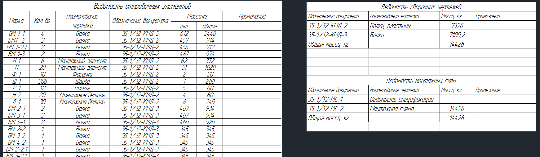 - столбец с массой по каждому чертежу