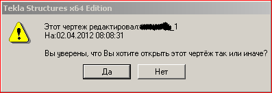 В таком случае на сервере создается новый пользователь в модели и за ним будет сохранятся создание чертежа (по НИКу) . И при открытии чертежа будет выводится запрос о работе с чертежом другим пользователем_1 или пользователем_2, которое сохраняется "намертво" в модели.Таран Д. А. писал(а):При больших моделях рекомендую запускать на одном компьютере сразу две теклы. При нумерации использовать одну из запущенных версий программ а для работы в модели и ли чертежах использовать вторую теклу в той же модели.