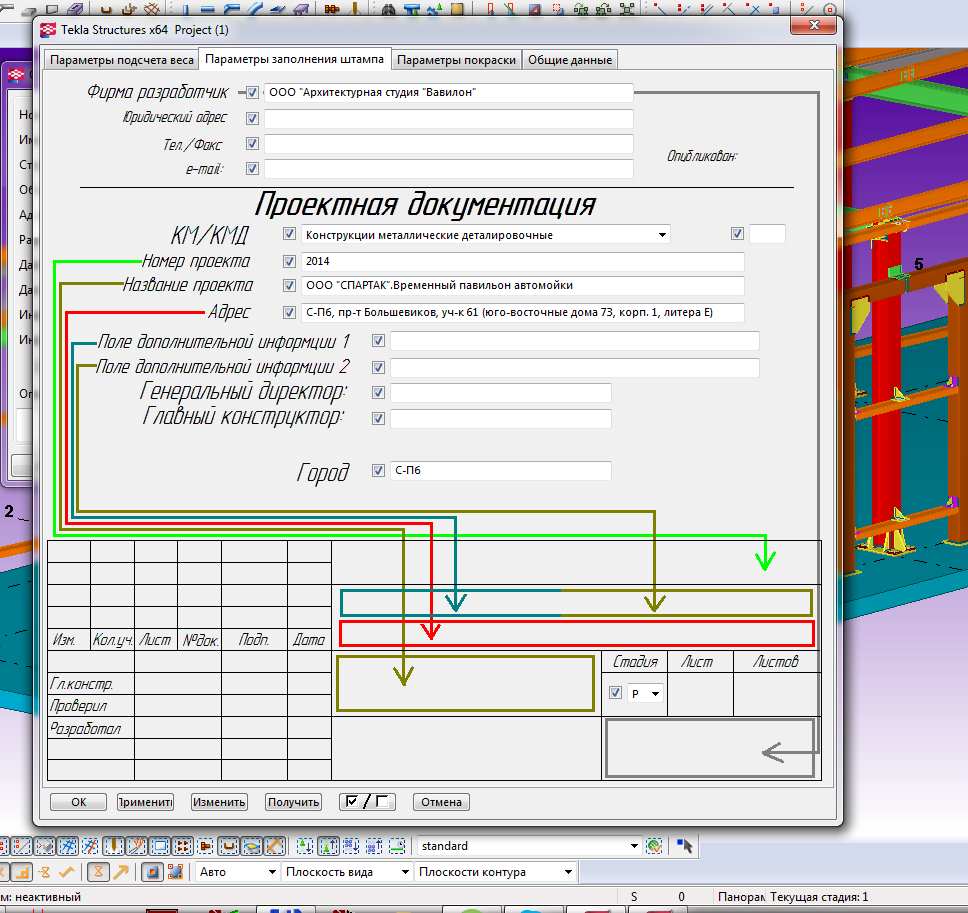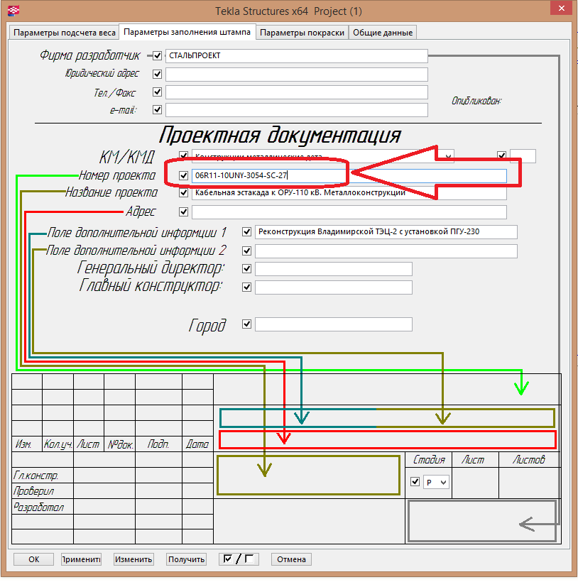 Как заполнить номер проекта и номер чертежа Tekla Structures