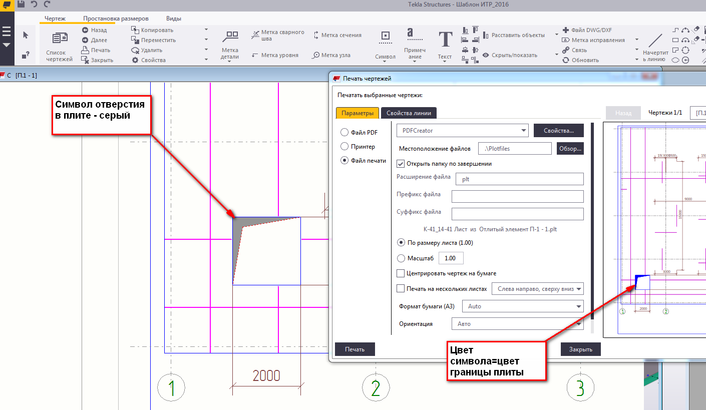 Создал автоматически (через расширенный параметр) символ отверстия в плите перекрытия. По умолчанию цвет символа отверстия=цвету границы плиты. Я поменял цвет (в соответствующем файле с расширением .sym) символа через редактор символов на серый и в результате получил следующее:
