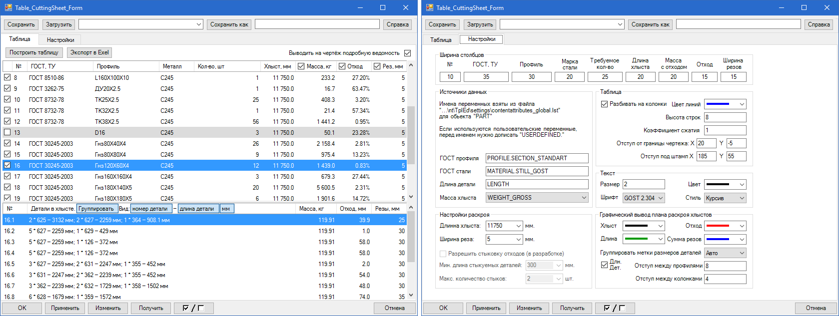 Сразу видно необходимое количество хлыстов, массу стали для заказа, план раскроя.