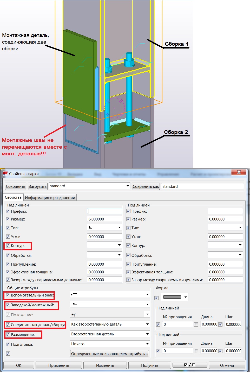 1. Не могу дальше работать из-за такой проблемы. Назначаю монтажный шов на монтажную деталь, соединяющую две сборки. Этот шов получается отдельным от детали и с ней не перемещается (см. скриншот). Назначал этот шов разными способами. Причем с цеховыми швами, в выделенной на скриншоте сборке, таких проблем нет.