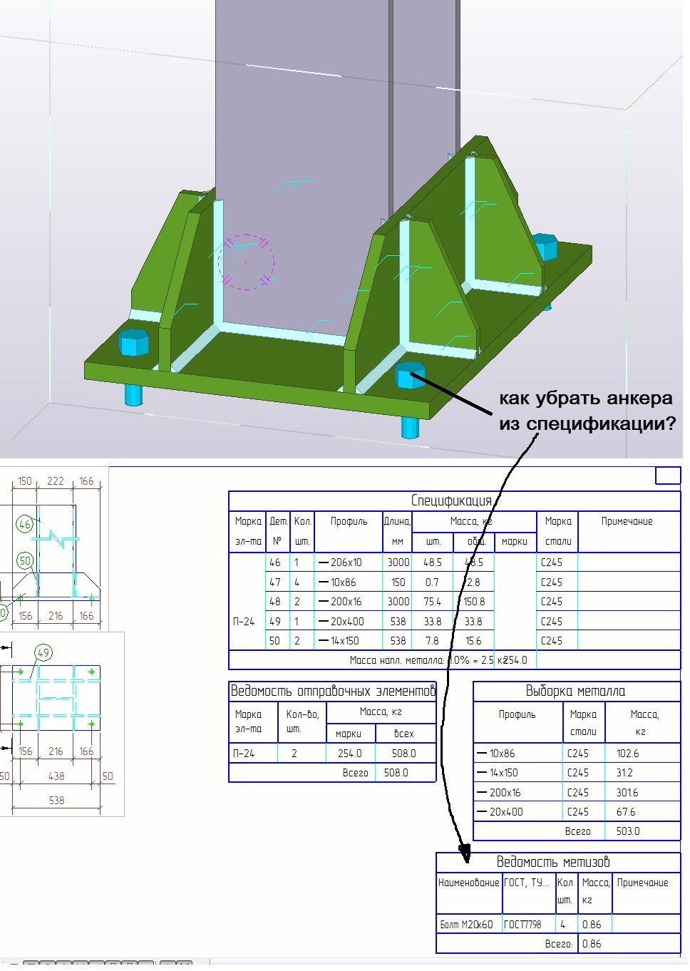 Помогите разобраться! В моем компоненте "база колонны" анкера нужны только как ссылочная геометрия, для образования отверстий в опорной плите. На моих чертежах они должны быть указаны условно тонкими линиями для общей картины. Как сделать, чтобы программа не учитывала их в спецификации? Т.е. в сборочном чертеже колонны их вообще не должны быть. Назначение анкеров в модели - только для образования отверстий и как ссылочная геометрия на СБ чертеже колонны.