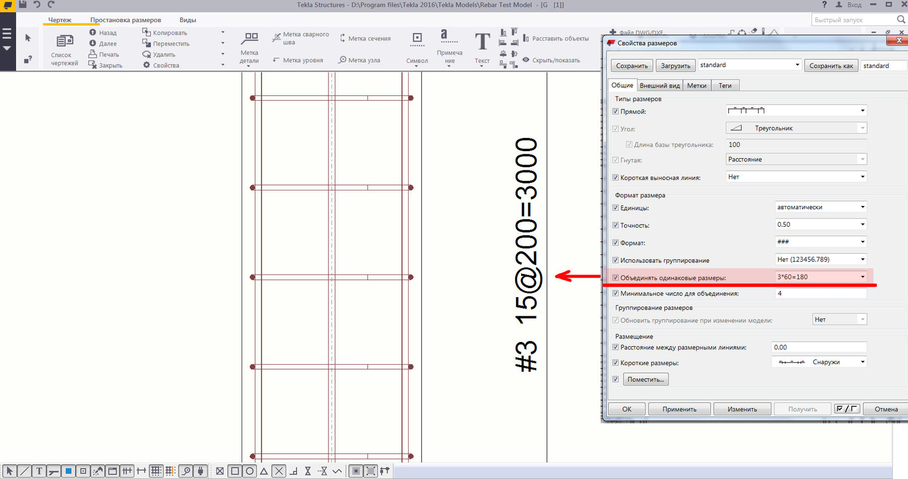 Проблема с функцией "Объединять одинаковые размеры" Tekla Structures