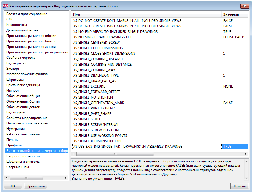 Можно указать, следует ли создавать на чертежах сборок новые виды или использовать виды из существующих чертежей отдельных деталей. При значении TRUE на чертежах сборок будут использоваться виды из существующих чертежей отдельных деталей. При значении FALSE или при отсутствии существующего чертежа отдельной детали для данной детали создается новый вид в соответствии со значением параметра Атрибуты отдельной детали (Свойства чертежа сборки > Компоновка > Другое). Значение по умолчанию — FALSE.