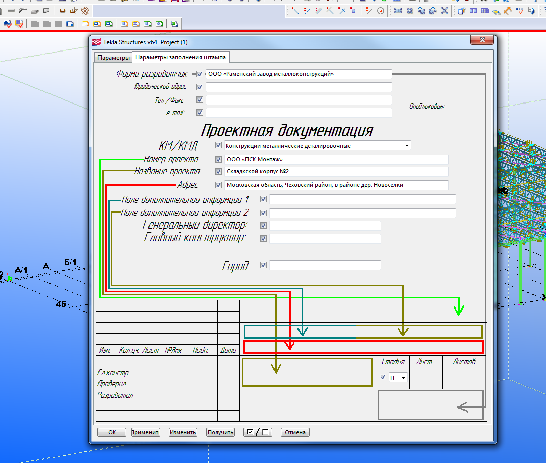 в параметрах заполнения штампа есть пункт номер проекта и отведена зеленая стрелка как раз в верхнию строчку где название фирмы заказчика. тогда куда фирму писать? самое интересно что в чертеже у меня пишет название фирмы как надо в верхней строчке и дублируется в поле марки.Арсен писал(а):1)Утебя номер проекта перепутан с названием фирмы в настройках модели.