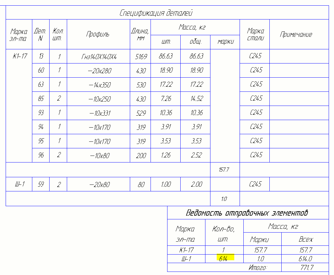 Добрый день, помогите пожалуйста разобраться с таблицами в среде топинженер. У меня есть сборка колонны, с ней в комплекте должны идти 2 шайбы. В ведомости деталей показано, что их 2, но в ведомости отправочных марок пишется количество из всей модели. База колонны сделана плагином X_plugins, сварка шайб стоит монтажная. Можно ли как-то сделать, чтобы мне в ведомости отправочных марок указывалось количество подсборок, которые необходимы на именно то количество сборок, которые находятся на чертеже, то есть 1 колонна - 2 шайбы и т.д.