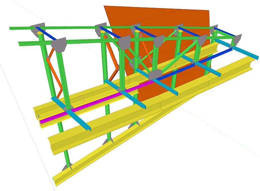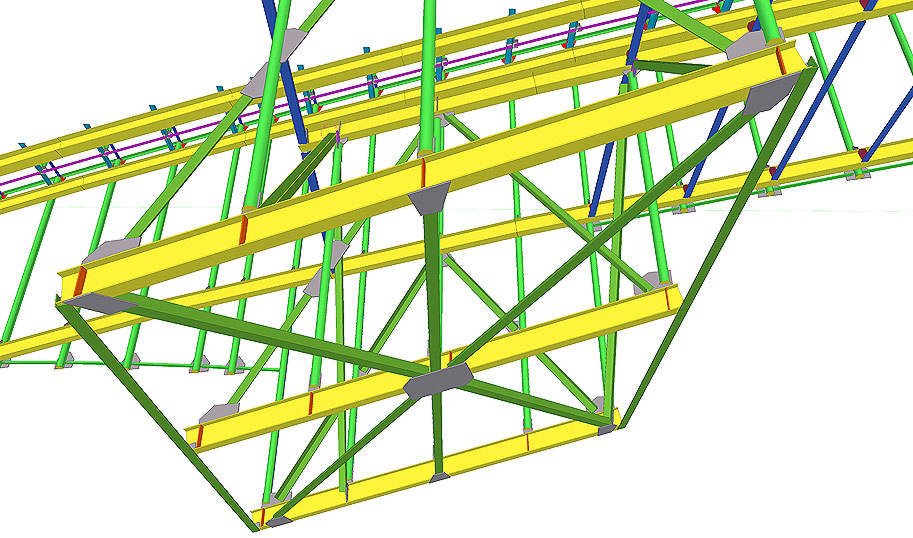 Отдельной проблемой служила опора конструкции со сложной геометрией, большинство балок которой лежало в разных плоскостях; части конструкции, которые все же лежали в одной плоскости, не являлись параллельными.