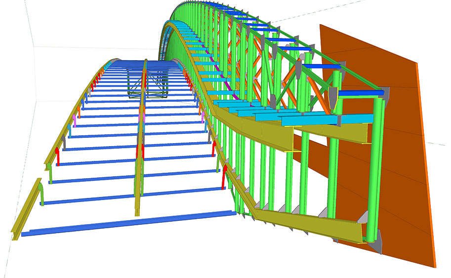 Конструкция представляет из себя объемную ферму со сложной силовой структурой, образующую сложную кривую.