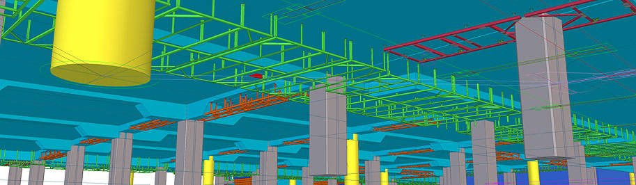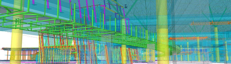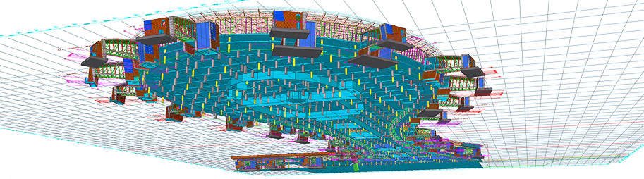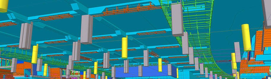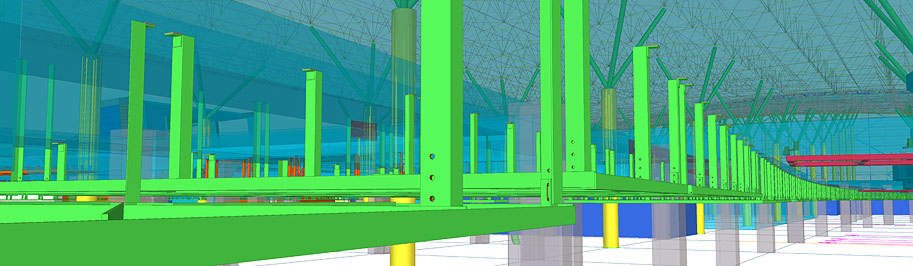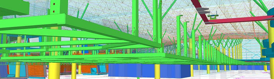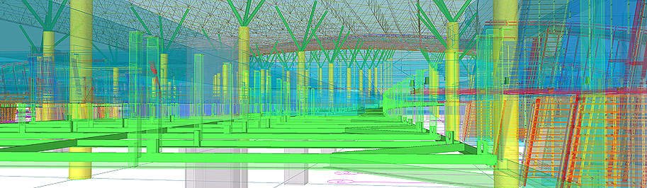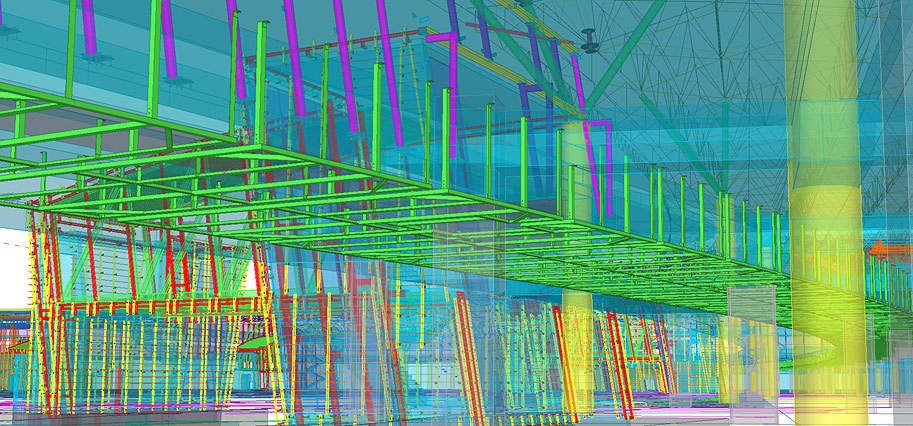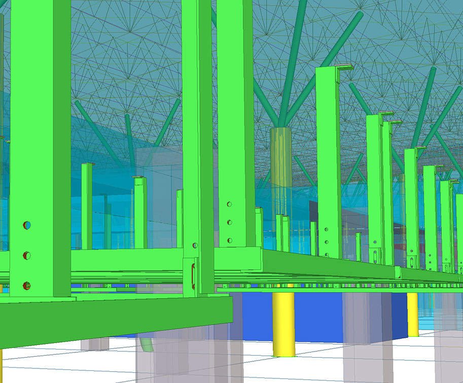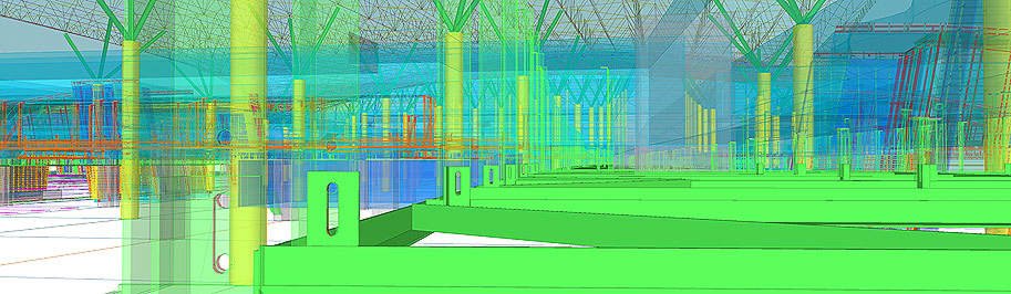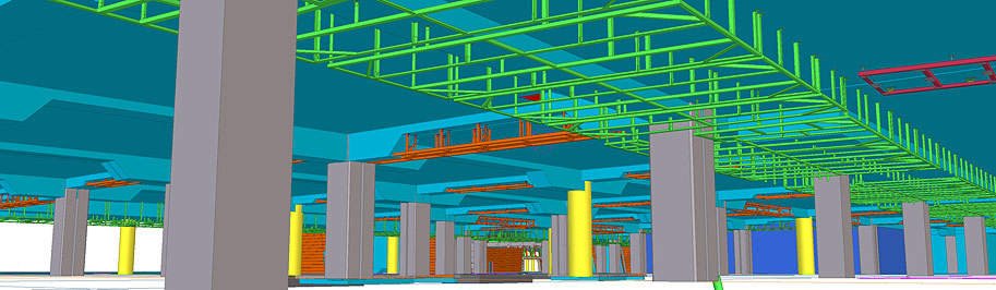 Документация на все стальные конструкции под облицовку потолка делится на два комплекта КМ: облицовка периметра здания (металлические конструкции показаны зеленым цветом) и облицовка фигурного брюха (красный и оранжевый цвет).