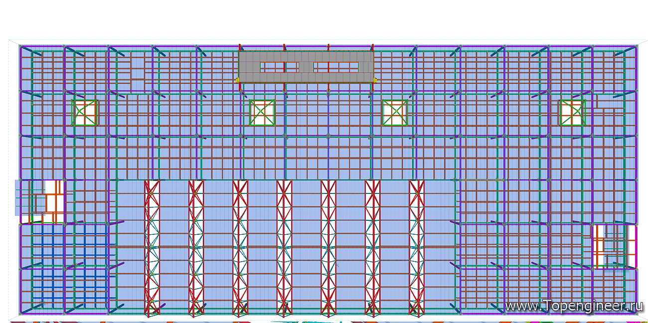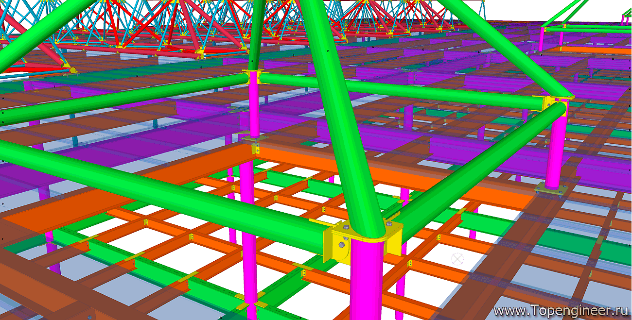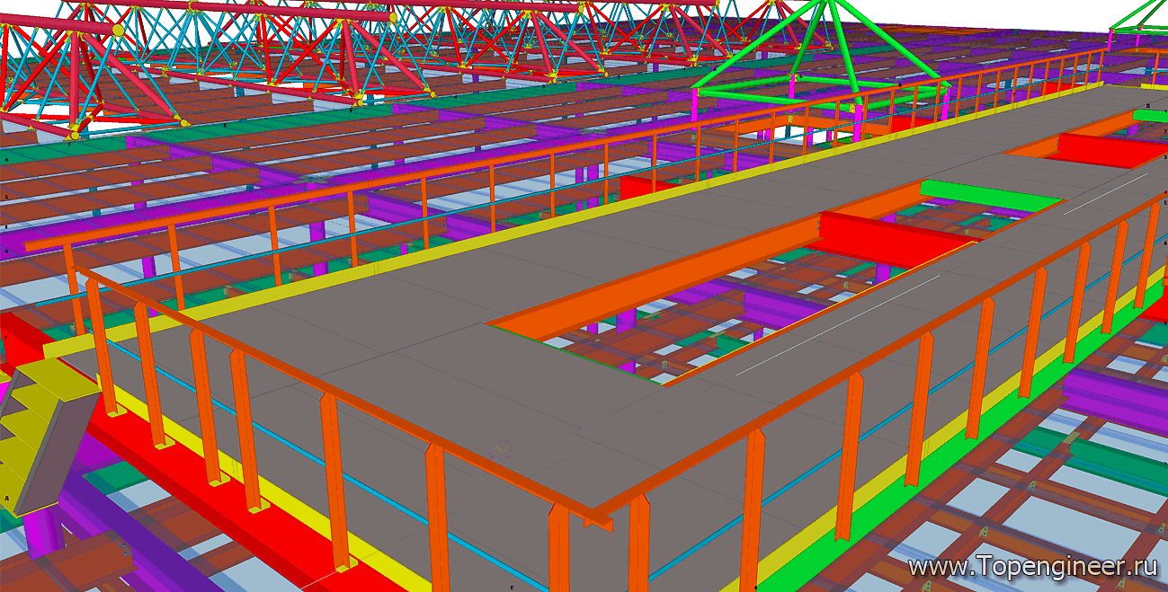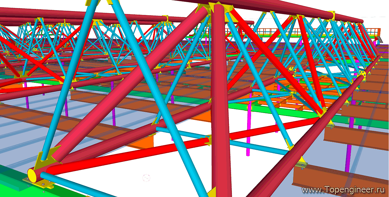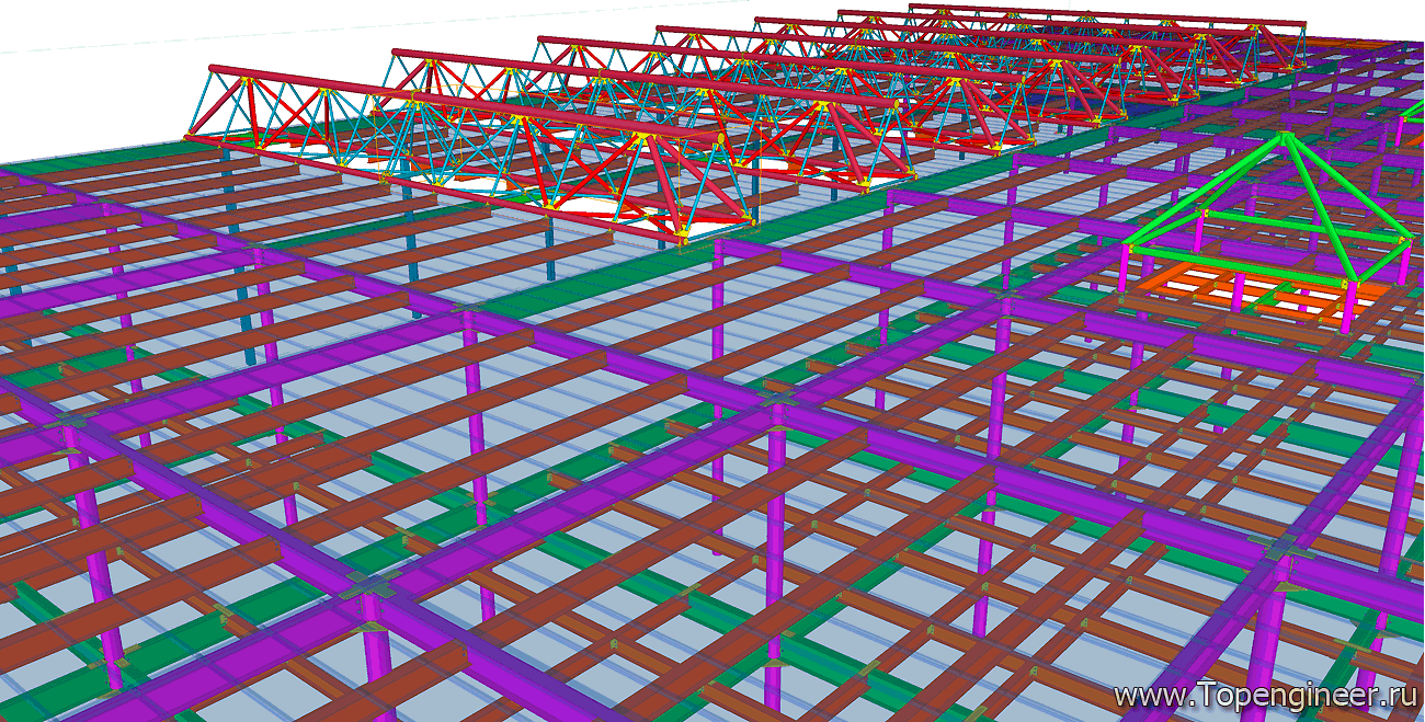 Так как площади подобных помещения как правило велики, имеет смысл применять конструкции с высокой степенью повторяемости. Широкое распространение при проектировании предприятий получили разнообразные фермы.