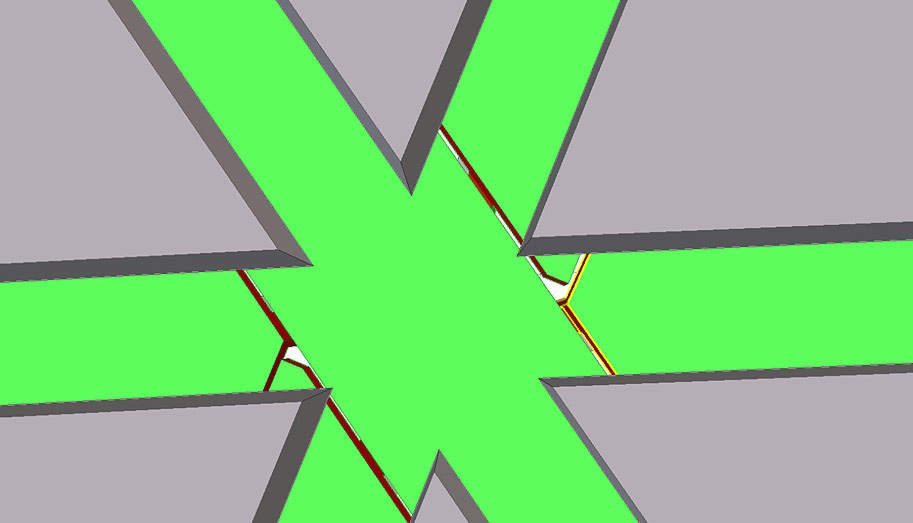 В каждом узле между балками существует зазор в 2 мм, необходимый для проведения сварочных работ. Сварной шов шлифуется. Серым цветом показано расположение стеклопакетов. Стекло заходит на металл на 13 мм. Ширина резины, на которую опирается стекло, составляет всего 6 мм.