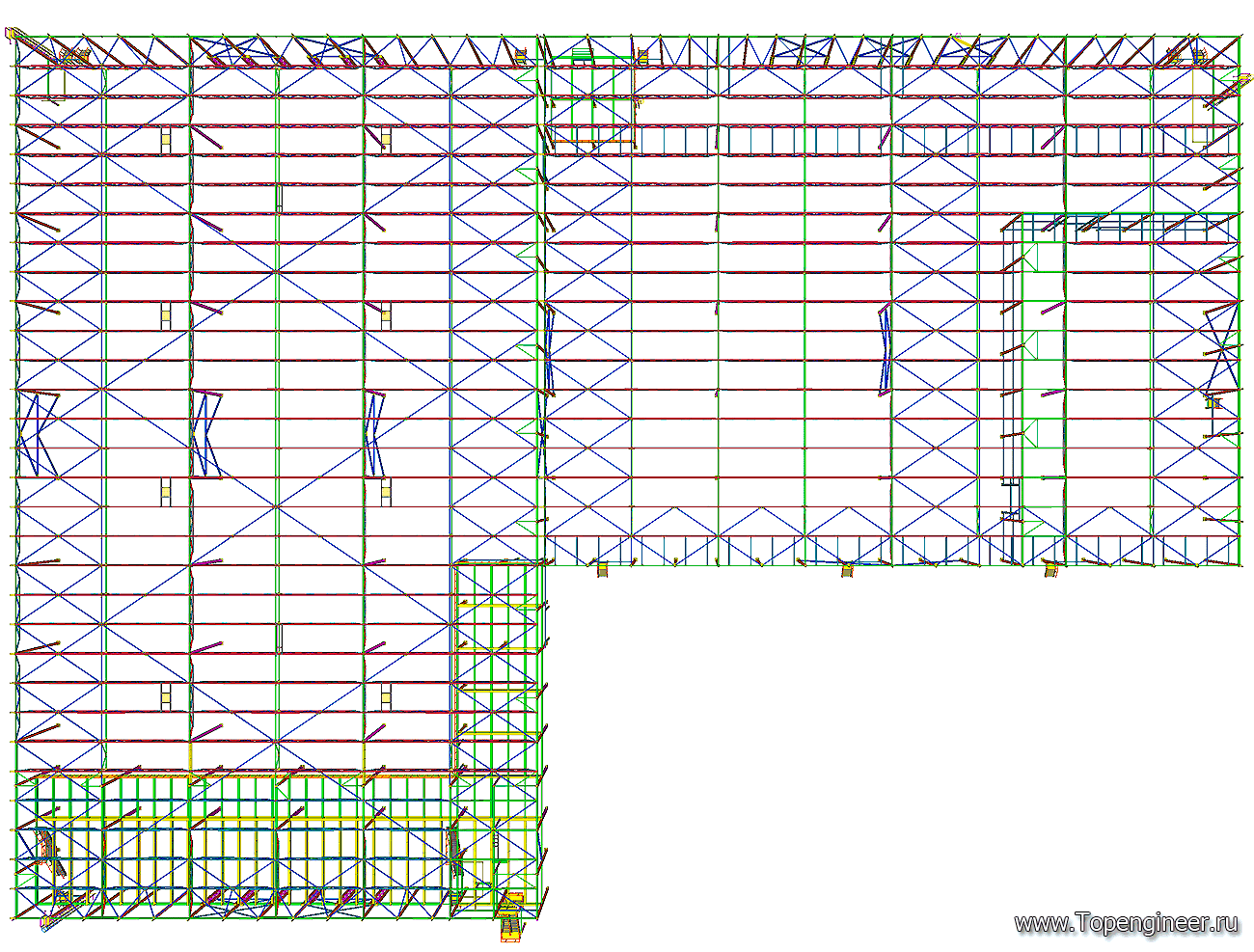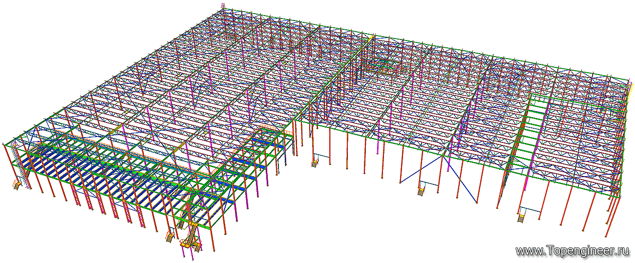 Общий вид склада. Вид сверху. Кровля выполнена из ферм изготовленных из квадратных труб. Все соединения выполненных на болтах соединениях. Проект не предусматривает использование сварочного аппарата на монтаже. За счет использование болтовых соединений достигается максимально сжатые сроки по возведению готовой конструкции.