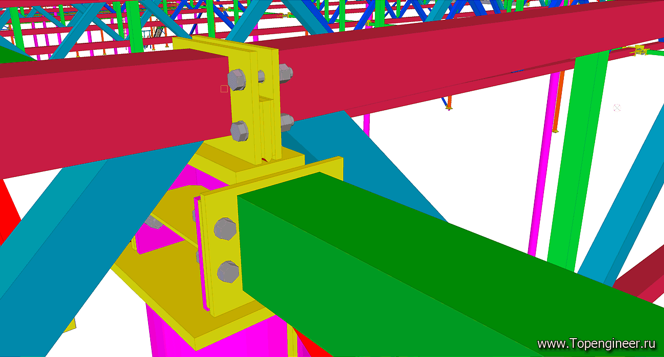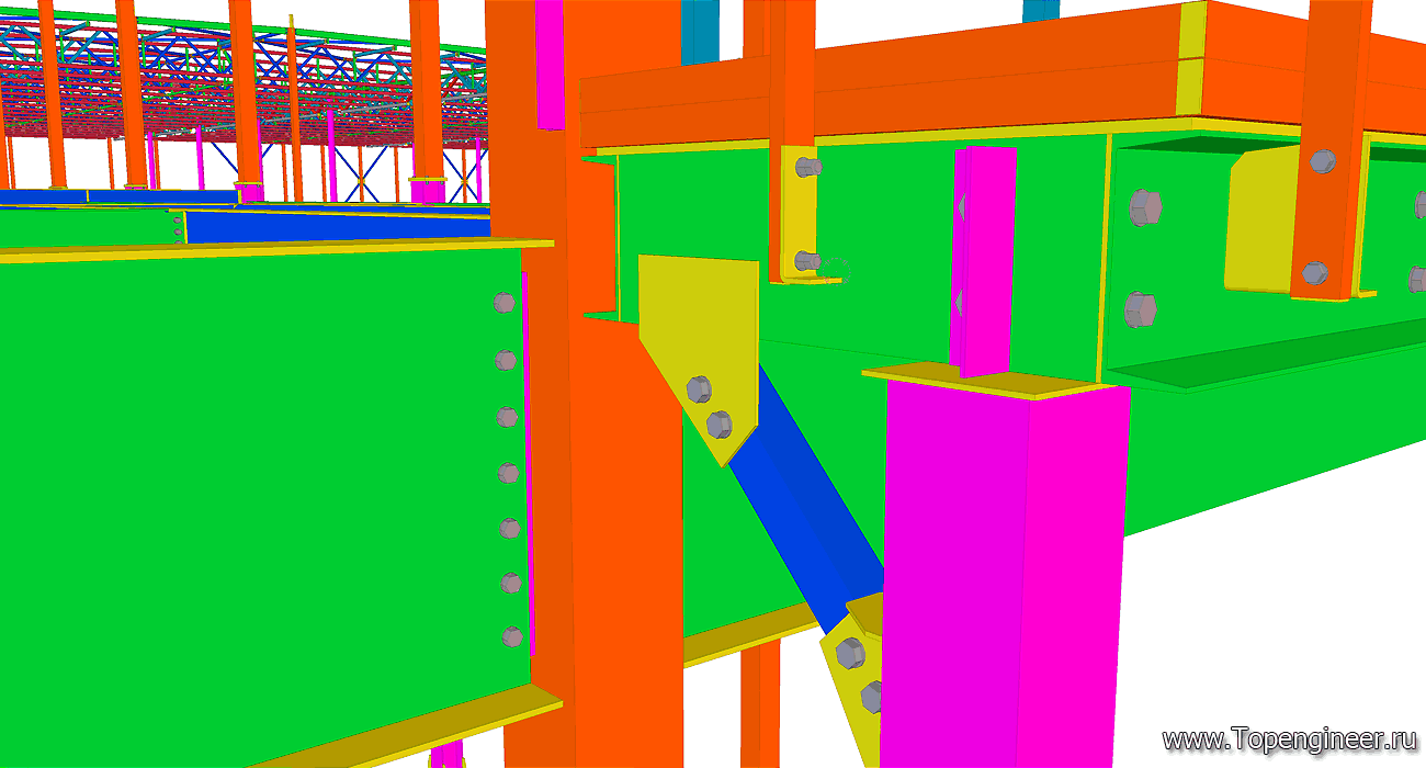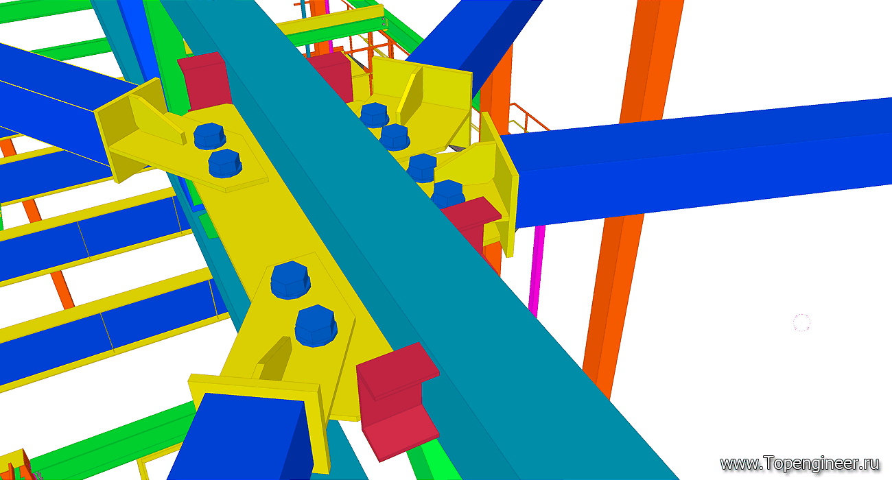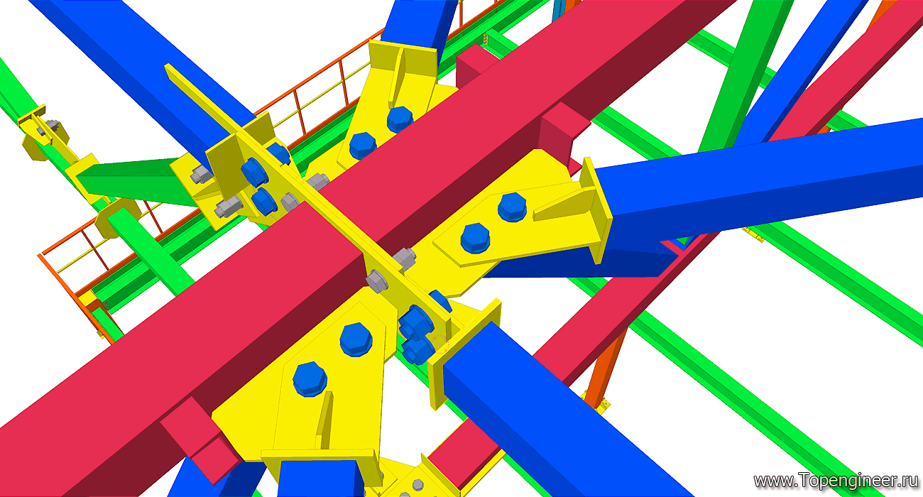 Типовой узел крепления связи в проекте склада. Красным обозначены профиля ферм кровли. Синим профиля связей. Болты обозначенные синим цветом – высокопрочные с контролируемым усилие затяжки. Болтовые соединения, обозначенные серым – обычные болты без контроля усилия затяжки.