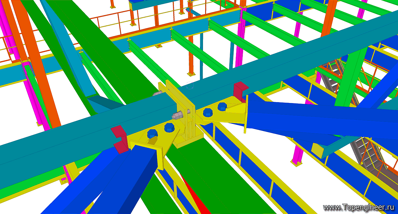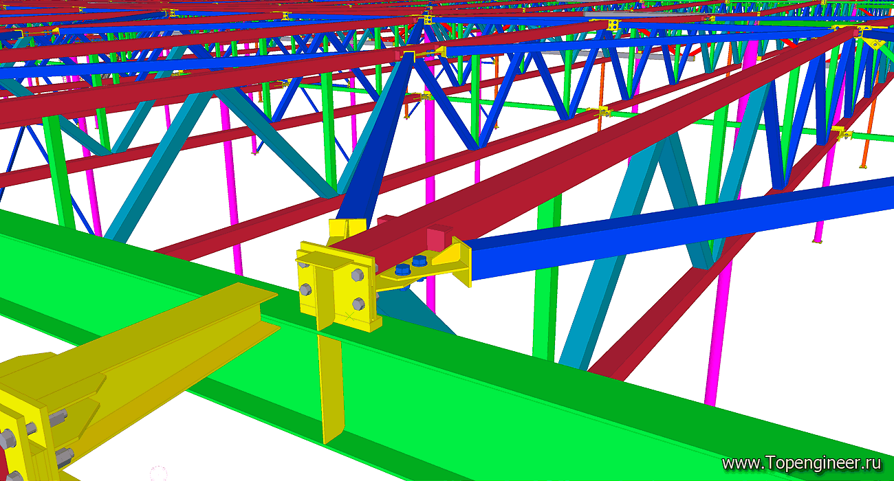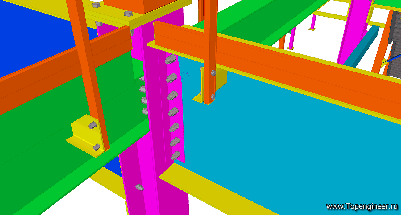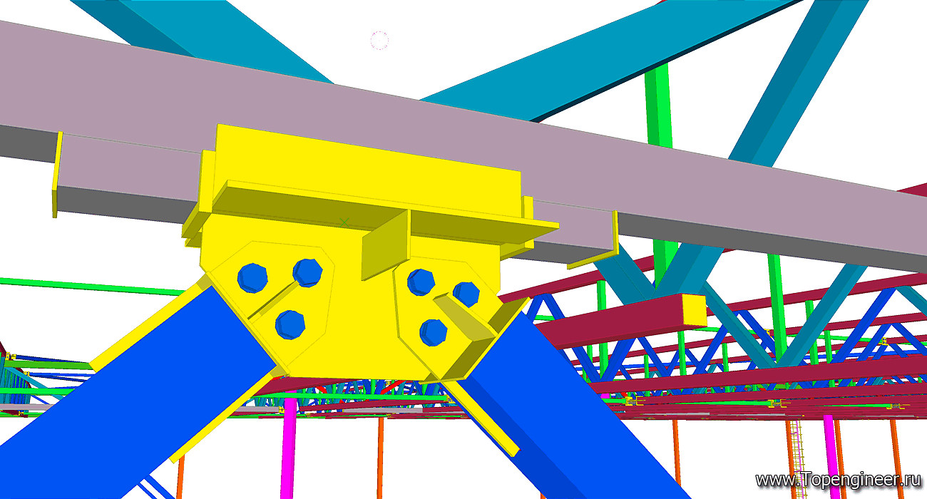 Типовой узел крепления связи в проекте склада. Красным обозначены профиля ферм кровли. Синим профиля связей. Болты обозначенные синим цветом – высокопрочные с контролируемым усилие затяжки. Болтовые соединения, обозначенные серым – обычные болты без контроля усилия затяжки.